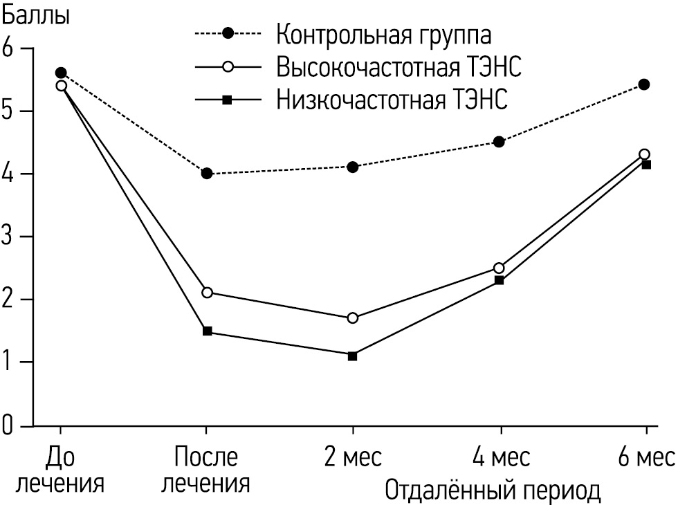 Рис. Выраженность аллодинии во всех исследованных группах по 10-балльной шкале до и после лечения и в отдалённом периоде в течение 6 месяцев. ТЭНС ― трансдермальная электронейростимуляция.