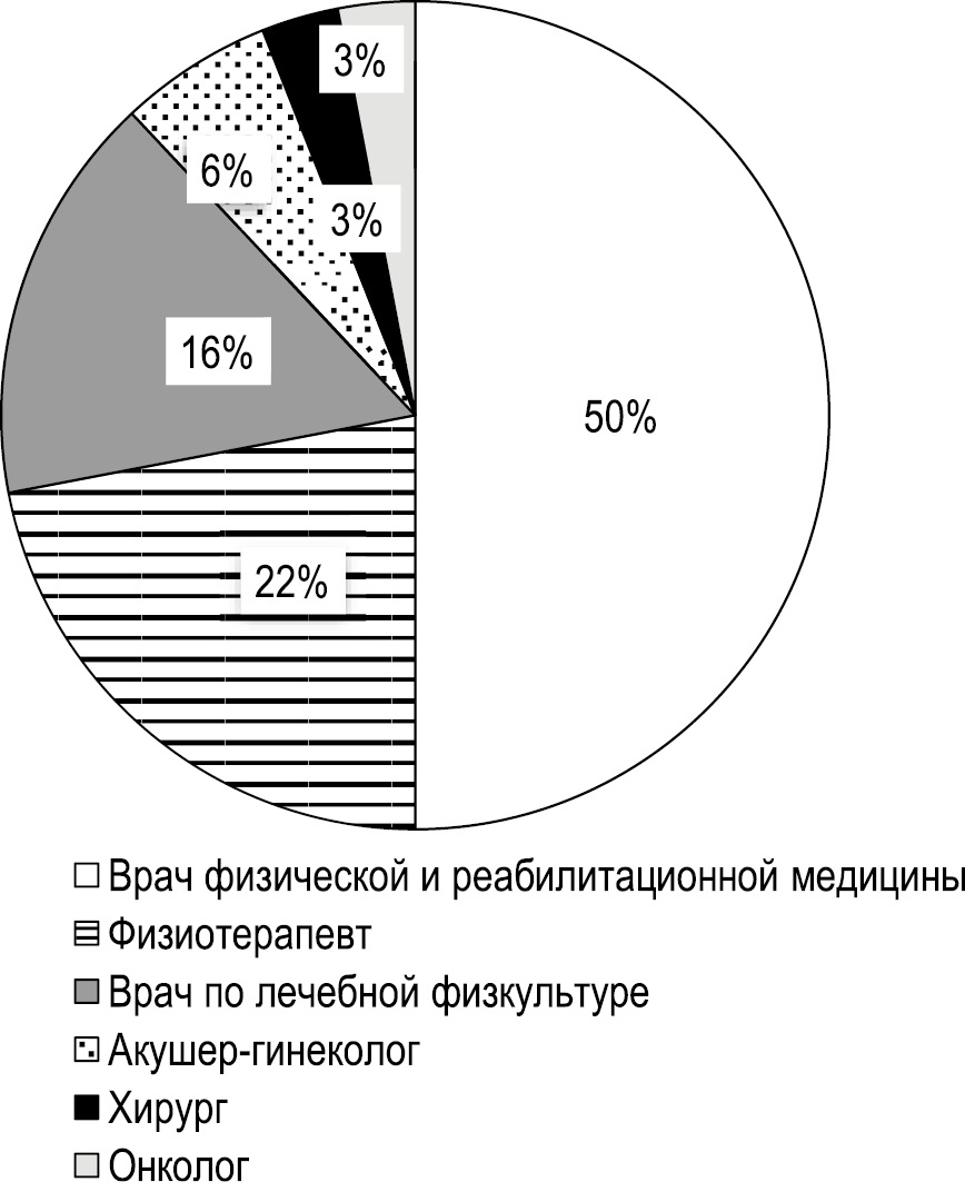 В исследование вошли врачи (n=201; 48 мужчин, 153 женщины), работающие в области физической и реабилитационной медицины, из 38 медицинских учреждений, 6 медицинских специальностей: 101 врач физической и реабилитационной медицины, 45 физиотерапевтов, 33 врача по лечебной физкультуре, 12 акушеров-гинекологов, 5 онкологов и 5 хирургов. Процентное распределение врачей разных специальностей представлено на рис. 1. Средний возраст врачей составил 38,0 [30, 0; 48, 0] (26–70) лет, стаж работы по специальности ― 13,0 [6, 0; 23, 0] (1–40) лет.