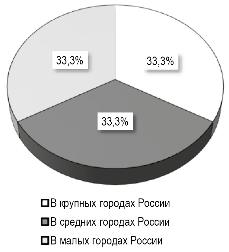 Врачи в исследуемой выборке, осуществляющие свою медицинскую деятельность в городах, различных по площади и плотности населения, имели равномерное распределение: по 33,3% (67/201) врачей работали в крупных, средних и малых городах России; в сельской местности не работал ни один из респондентов (рис. 2).