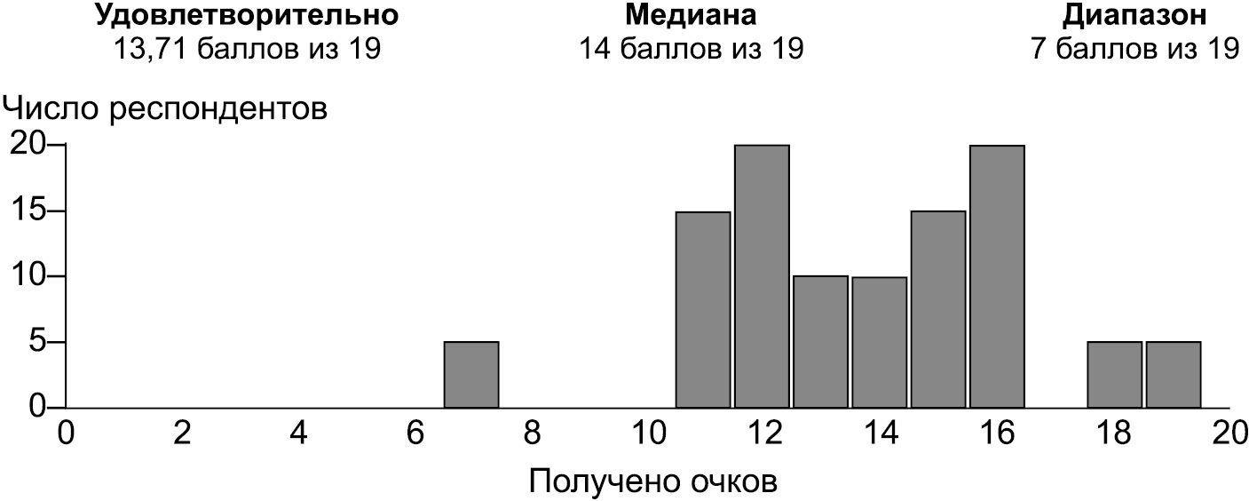 По результатам заполнения анкеты KCAHW, медиана правильных ответов составила 14 [7; 19] из 19 возможных (рисунок).
