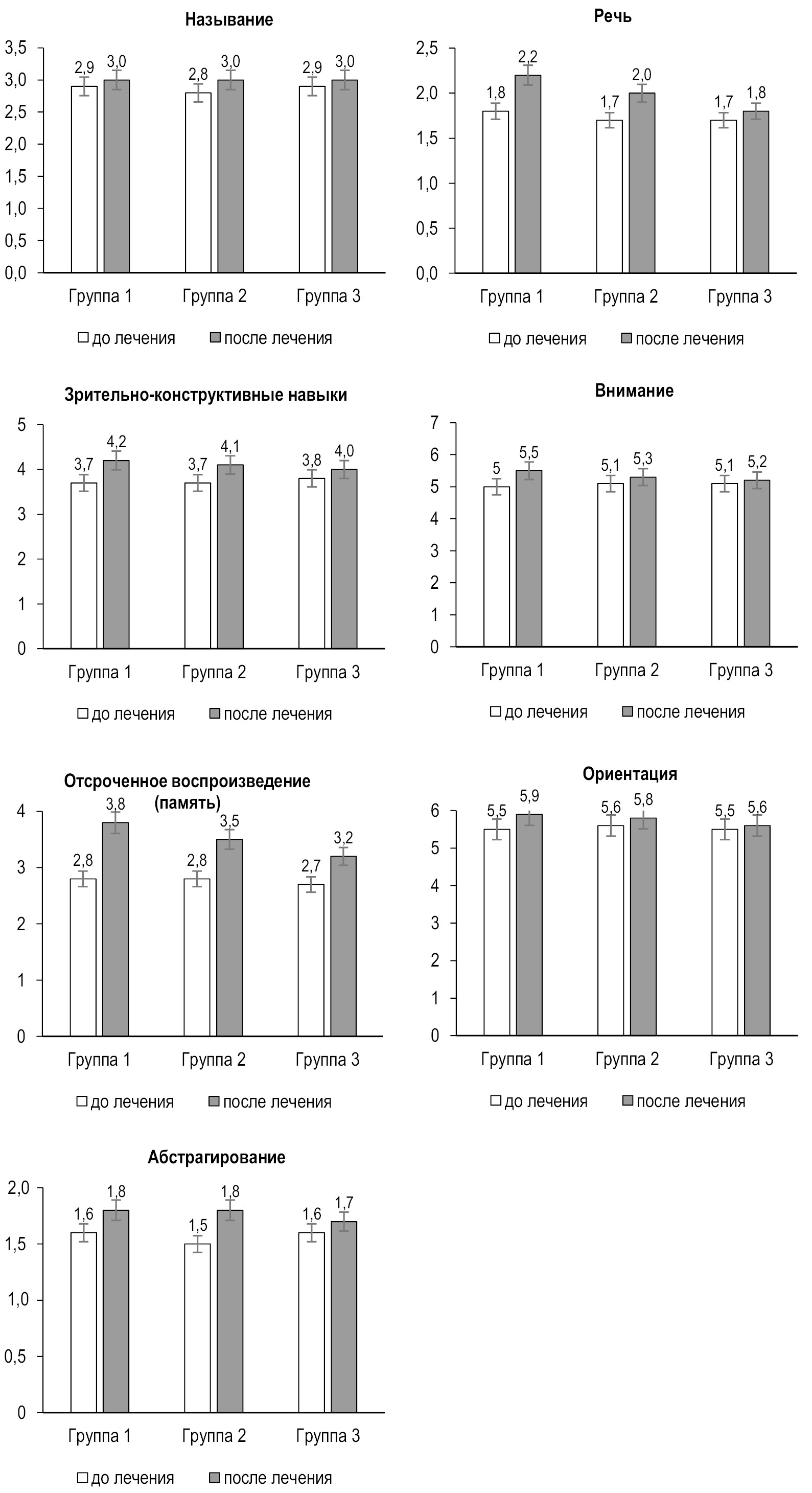 При более детальном анализе данных субшкал МоСа [зрительно-конструктивные/исполнительные навыки, называние, внимание, речь, абстракция, отсроченное воспроизведение (память), ориентация] после курса реабилитации была выявлена положительная динамика во всех группах обследованных (рис. 2), в большей степени в группе 1. Аналогичная динамика сохранялась и в более отсроченные периоды ― через 3 и 6 мес.