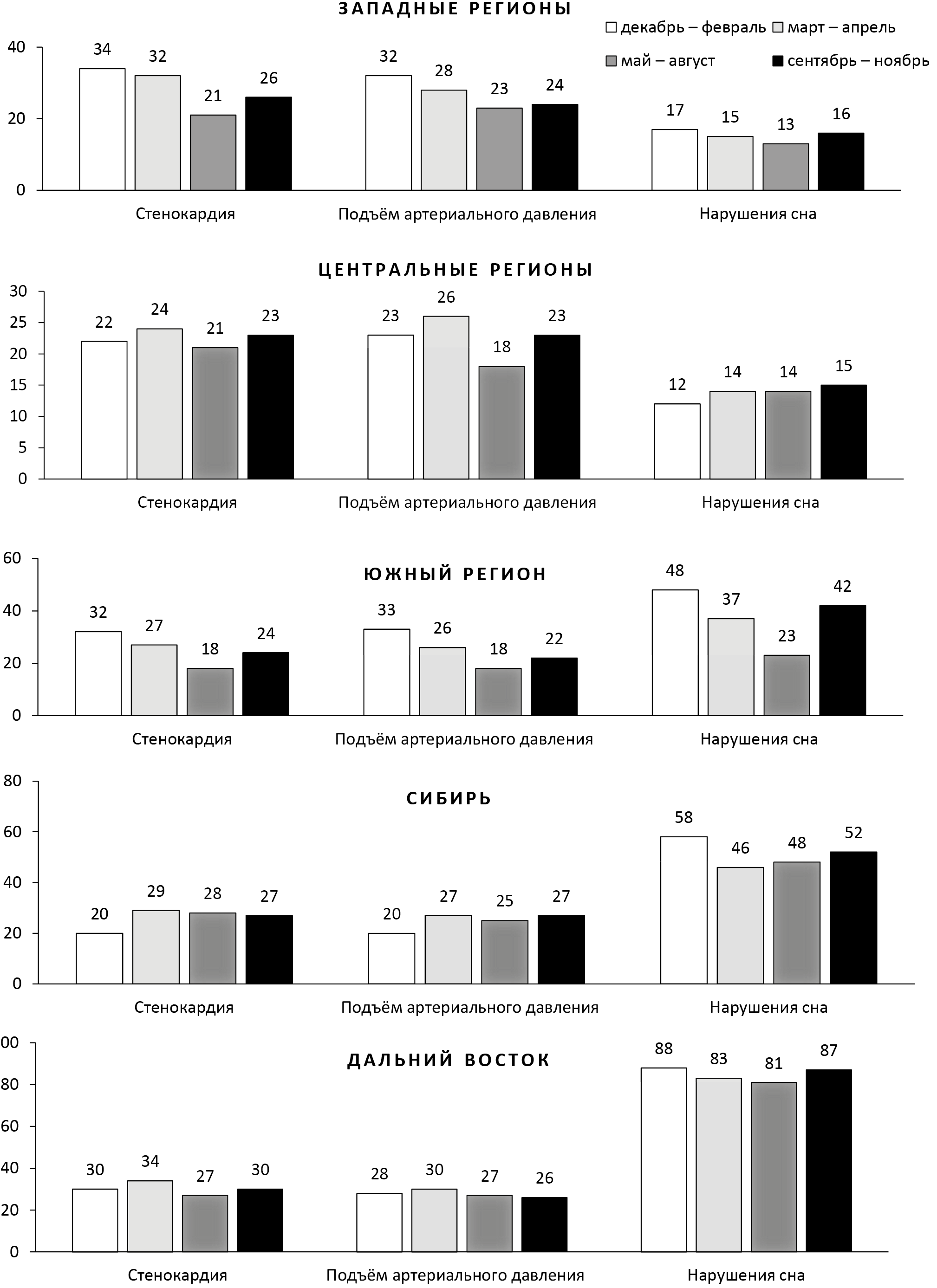 Перемена климата и поездка в санаторий вызывали в первые 4–5 дней, т.е. в период акклиматизации, учащение приступов стенокардии у 38% с увеличением продолжительности приступа у 23% пациентов, сердцебиение у 55% и нарушения ритма у 34% (преимущественно экстрасистолии). Повышение артериального давления отмечено у 70%, головные боли — у 52%, головокружения — у 31% отдыхающих. Это связано со спецификой кардиологического санатория, длительностью и повышенной нагрузкой поездки, особенно из отдалённых регионов России, а также отсутствием должного уровня профилактической медикаментозной терапии, а иногда и корректного диагноза при прибытии отдыхающих из малых населённых пунктов. Нельзя сбрасывать со счетов и то, что нахождение вблизи столицы у многих вызывало желание максимально быстро посмотреть город, значительно увеличивая при этом физическую и эмоциональную нагрузку, несмотря на замечания медперсонала. Это же способствовало тому, что в 52% случаев отдыхающие отмечали усиление одышки, чувство подавленности, угнетённости (69%), раздражительности (66%) и нарушения сна (67%). Расценивать столь высокие показатели, как метеочувствительность, является неправильным. Это период акклиматизации не только к другим климатическим условиям, но и к часовому поясу. Поэтому первоначально полученные данные из дальнейшей статистической работы исключались. И говорить о метеочувствительности мы сочли разумным только после акклиматизации пациентов к новым условиям курорта. В обязательном порядке необходимо выделять особенности метеолабильности пациентов из разных регионов, зависящие не только от постоянного места жительства, но и времени года, что показано на рис. 1.