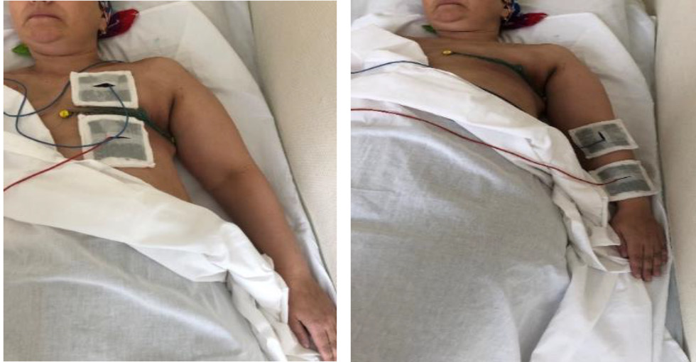 Пациентам 1-й группы в раннем послеоперационном периоде (2–4-е сутки) на фоне стандартной терапии проводили электротерапию апериодическими токами малой силы и низкого напряжения с беспорядочно меняющимися (от 200 до 2000 Гц) частотой и амплитудой (флюктуирующие токи) с помощью аппарата для флюктуризации АСБ-2М (Каскад-ФТО, Москва; рег. удостоверение от 15.08.2016 № ФСР 2011/11395) по расширенной методике и дополнительно мышц предплечья: раздвоенный электрод располагали по краям послеоперационного шва, электрод площадью, равной суммарной площади двух электродов, помещали на заднюю поверхность плеча прооперированной стороны, затем дополнительно ― на мышцы предплечья (форма тока I, сила тока до 5–7 мА, до ощущения приятной мягкой вибрации, время воздействия 10 мин на поле). Суммарное время составило 20 мин, на курс 10 процедур (рис. 1).
