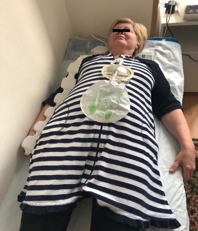 Пациенткам 3-й группы на фоне стандартной терапии в раннем послеоперационном периоде (2–4-е сутки) проводилась общая магнитотерапия на установке магнитотерапевтической с регулировкой частоты, модуляции и индукции вращающегося магнитного поля «Магнитотурботрон» (ООО НПФ «ММЦ "МАДИН"», Россия; регистрационное удостоверение № ФСР 022а2004/0613-04 от 21.09.2004), создающей равномерно вращающиеся вокруг продольной оси пациента импульсные магнитные поля с вариациями индукции от 0–3,5 мТл, частотой 50–150 Гц, ежедневно, курсом 10 процедур (рис. 3).
