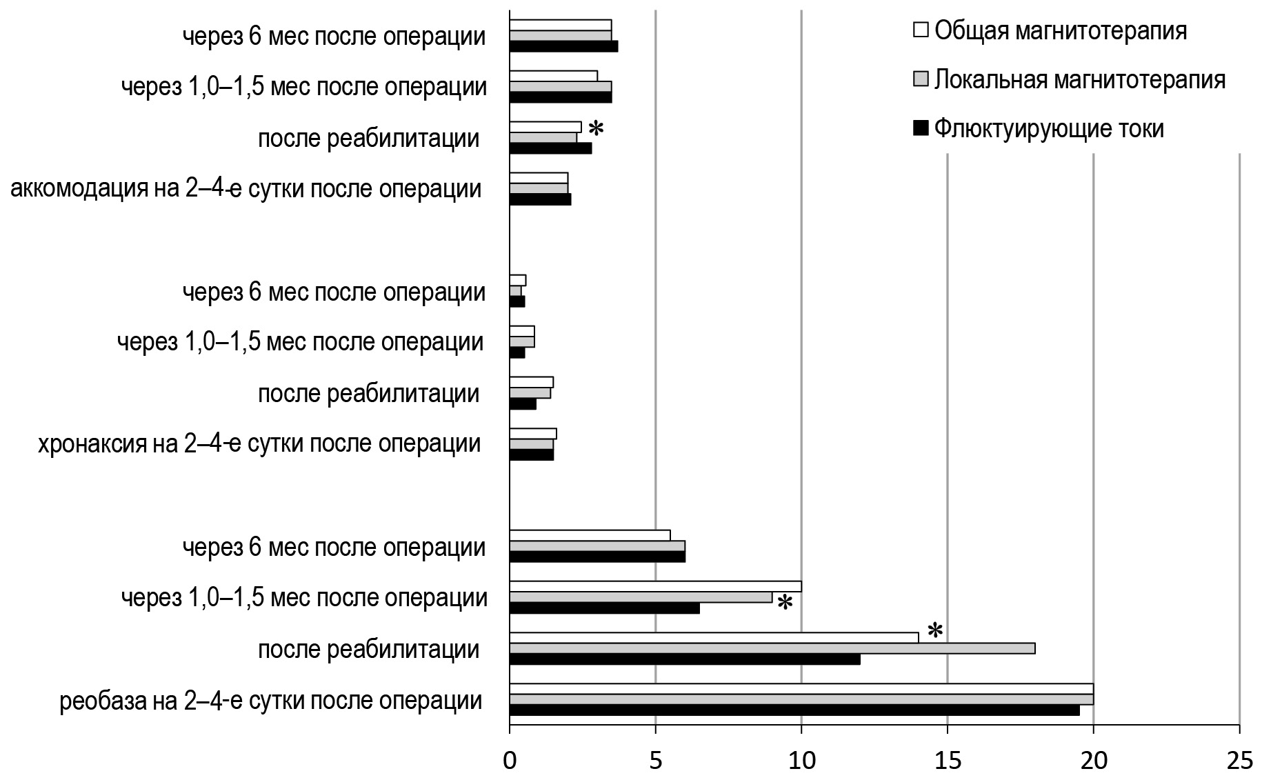Группа 3 (n=33) включала женщин, которым на фоне стандартной терапии в раннем послеоперационном периоде (2–4-е сутки) проводился курс (10 процедур) общей магнитотерапии.