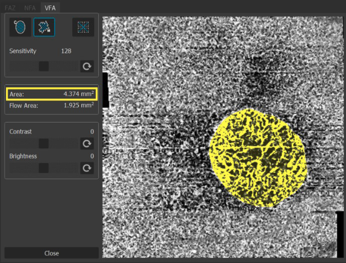 Рис. 1. Площадь атрофии ретинального пигментного эпителия, сопоставимая с зоной визуализируемых сосудов на уровне хориокапилляров в окне ангиограммы SOCT Copernicus REVO, выделена жёлтым прямоугольником.