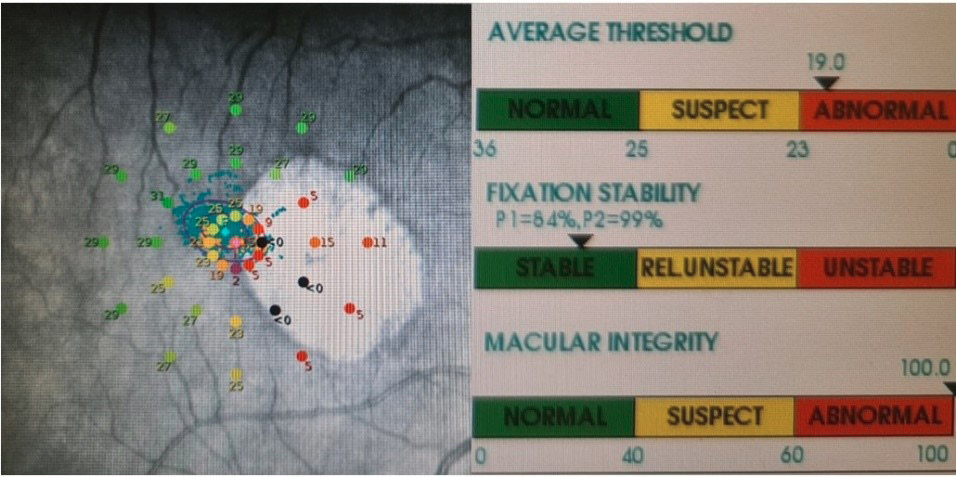 Fig. 2. Protocol for the study of the average threshold of retinal photosensitivity MS dB. Additional parameters: fixation stability (%), macular condition index (conl. units), which is calculated depending on the age norm presented in the MAIA device database. Functional depression of the central visual field, coordinating with the focus of retinal pigment epithelium atrophy, was revealed. MS=19dB.