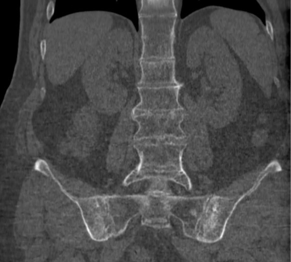 Рис. 1. Рентгенограмма пояснично-крестцового отдела позвоночника пациента с болезнью Бехтерева: на снимке визуализируется анкилоз крестцово-подвздошных сочленений и поясничных позвонков.