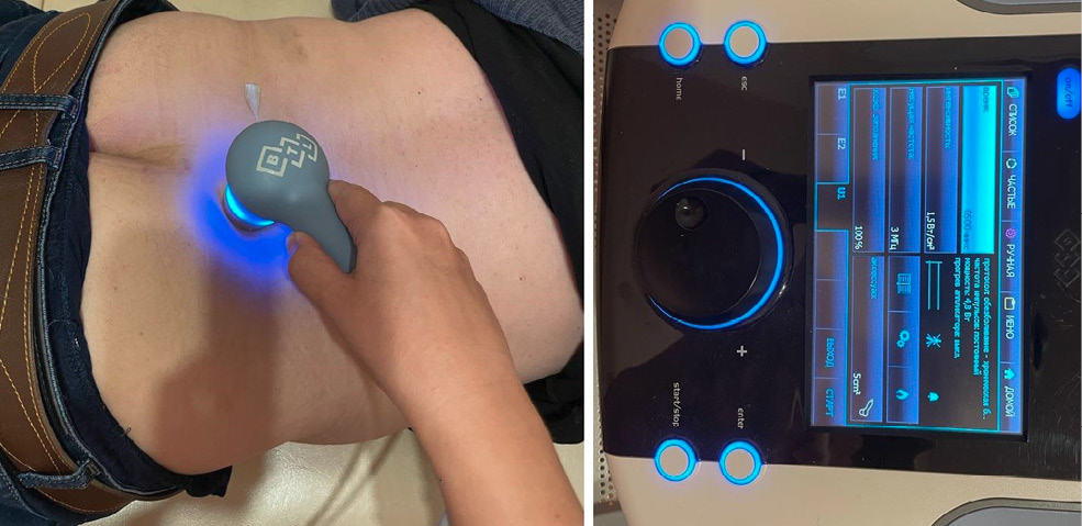 Рис. 3. Ультразвуковое воздействие на паравертебральные точки L5–S1 справа с использованием аппарата BTL-4000.