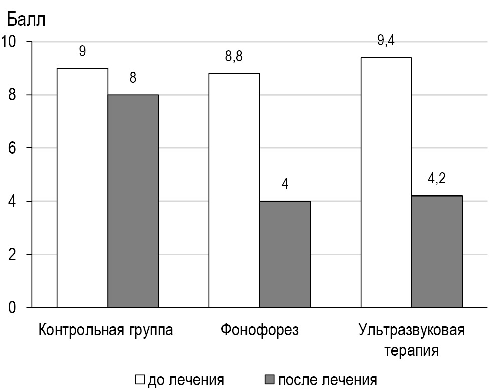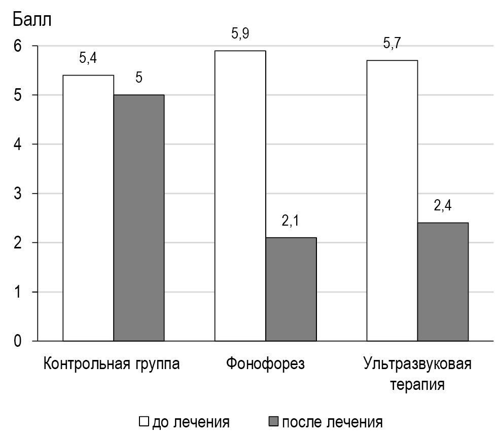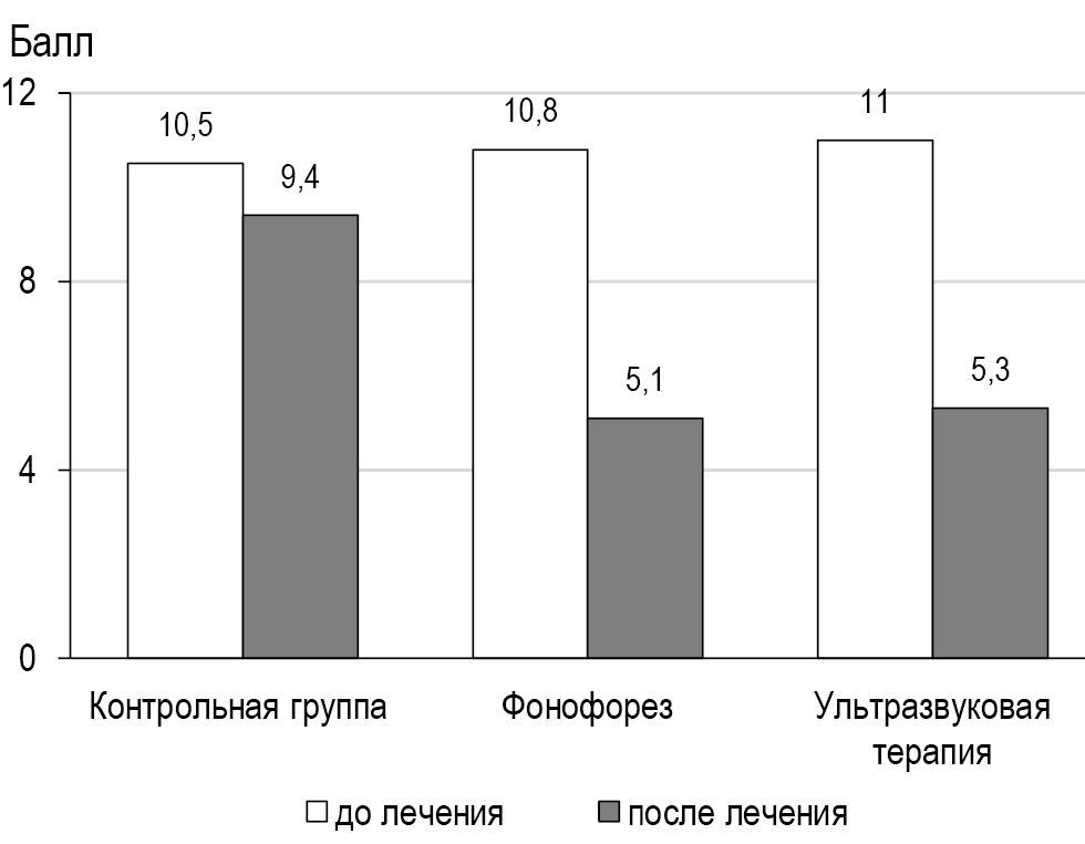 Результаты лечения с помощью электрофореза и фонофореза между собой существенно не отличались.
