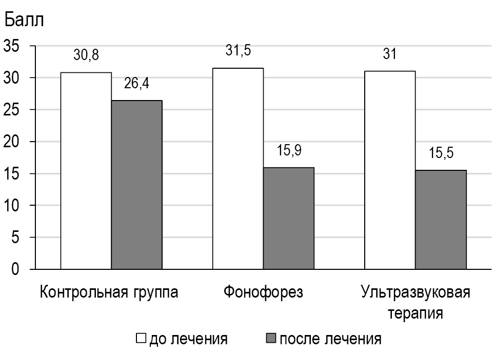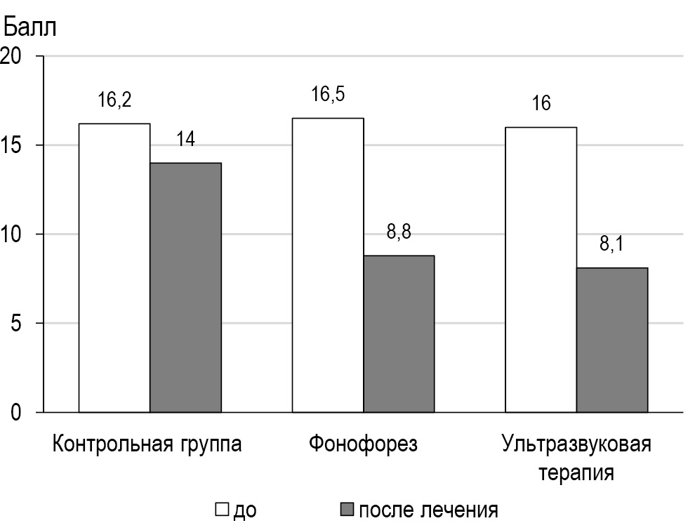 Болевой синдром уменьшился на фоне ультразвуковой терапии на 49,4% (p <0,05) и на фоне фонофореза на 46,7% (p <0,05). У пациентов контрольной группы показатели болевого синдрома сохранились без существенной динамики (p >1). При сравнении результатов, полученных в группах ультразвуковой терапии и фонофореза, достоверных отличий между ними не получено.