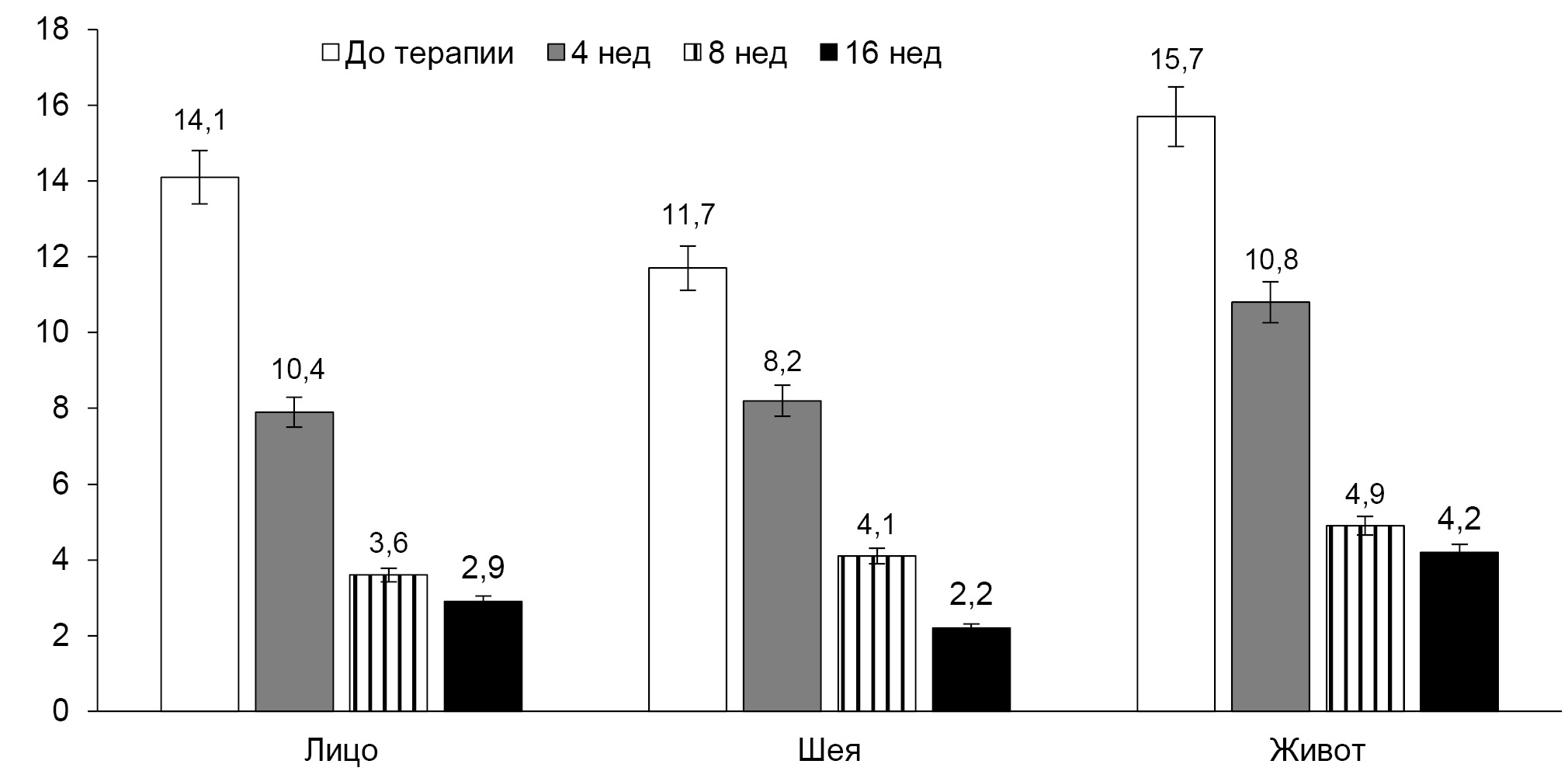 Суммарный индекс ДИШС продемонстрировал положительную динамику у всех пациентов (рис. 1). Редукция индекса ДИШС после первой процедуры (контрольная точка ― 4 нед) при локализации процесса на лице составила 43,8%: до терапии ― 14,1 [Q1=15,8; Q3=12,9], после процедуры ― 7,9 балла [Q1=9,2; Q3=11,8] (р <0,01); при локализации на шее ― 29,5%: до терапии ― 11,7 [Q1=11,3; Q3=13,5], после процедуры ― 8,2 балла [Q1=7,6; Q3=10,4] (р <0,01); при локализации на животе ― 31,2%: до терапии ― 15,7 [Q1=13,4; Q3=16,7], после процедуры ― 10,8 балла [Q1=10,1; Q3=12,4] (р <0,01).