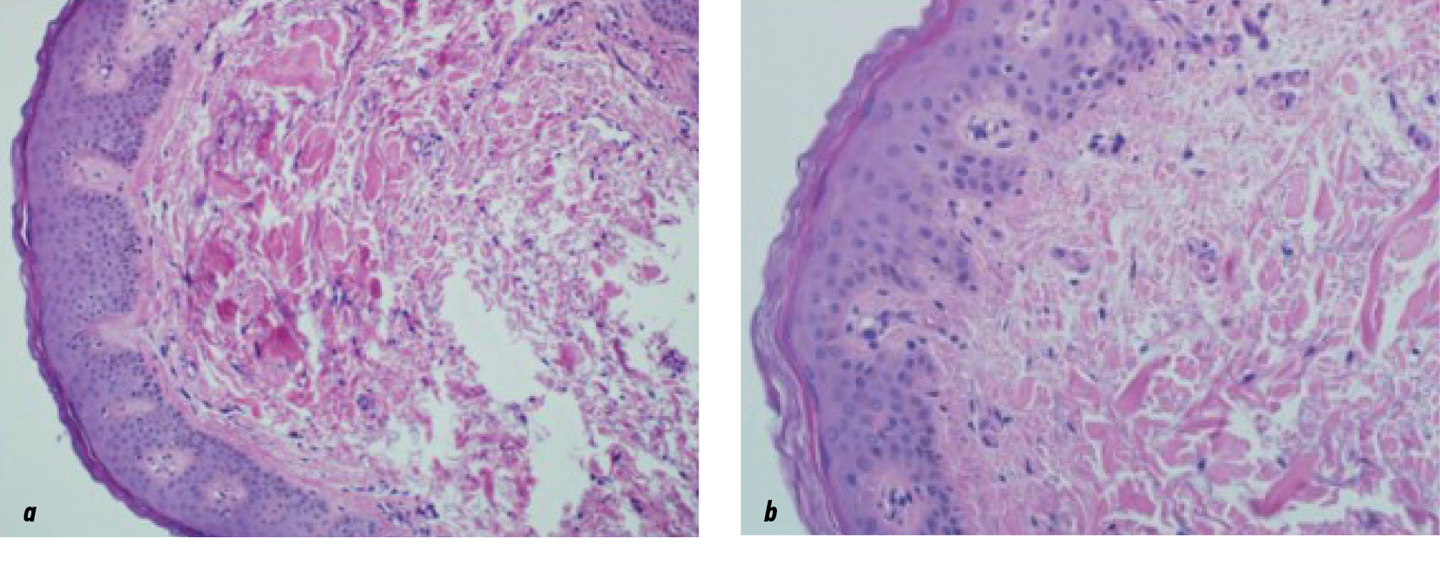 Рис. 2. Гистологическое исследование формирующегося гипертрофического рубца до (а) и после (b) лечения.