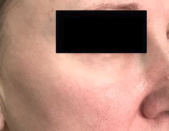 Из анамнеза: 3 дня назад пациентке на дому лицом без медицинского образования была проведена однократная процедура инъекционного липолиза в проекции области локализации малярных жировых пакетов и скул. На следующий день после процедуры пациентка отметила появление выраженного покраснения кожи, сопровождавшегося ощущением жара, покалыванием и уплотнением.