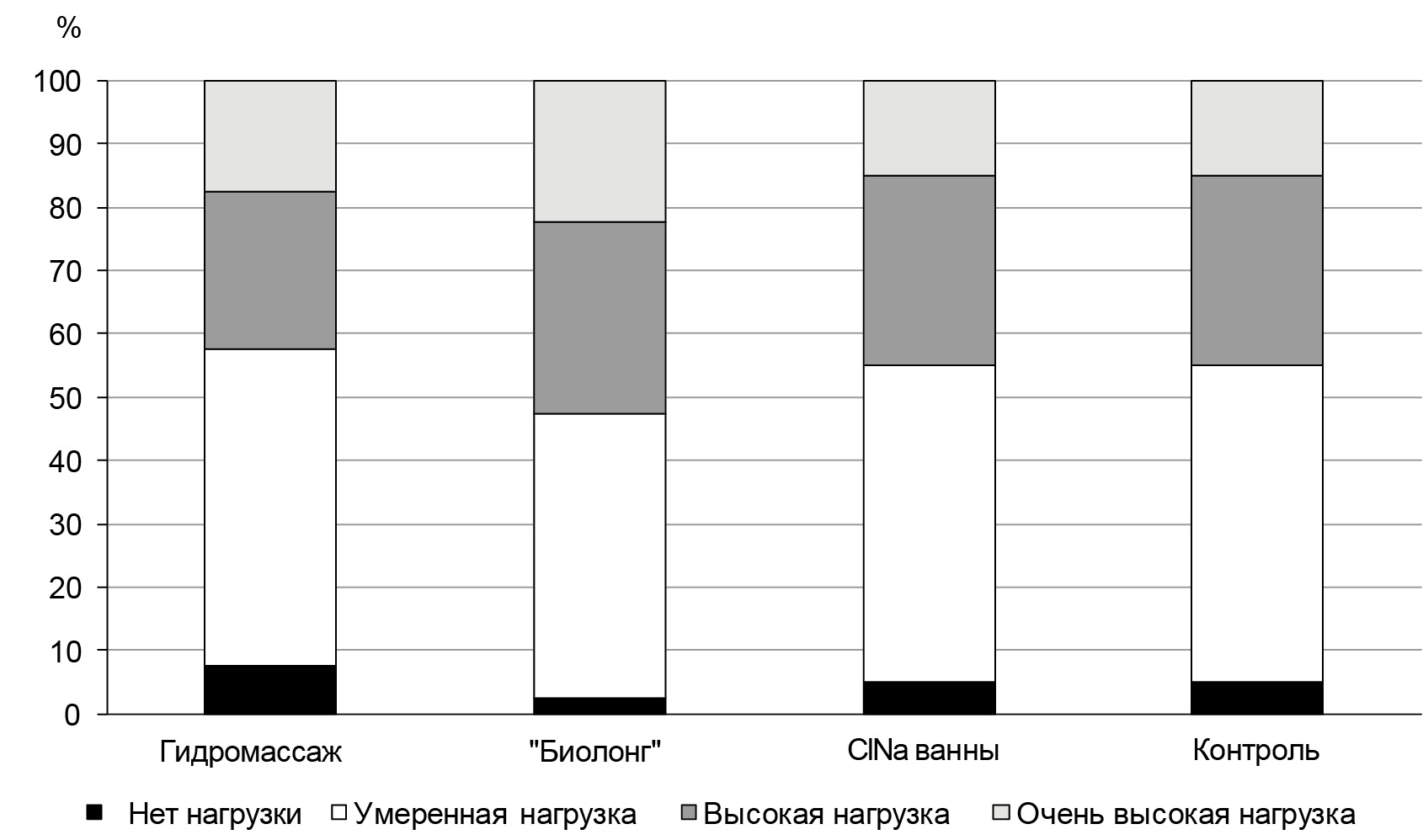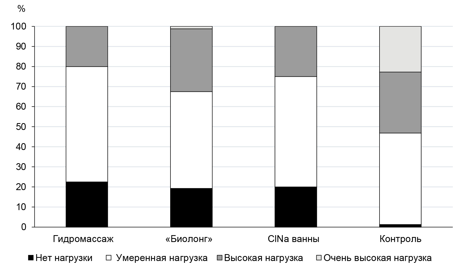 При оценке гормонального статуса пациентов каждый из средних показателей исследованных гормонов находился в пределах референсных значений. Однако при подсчёте индекса аллостатической нагрузки, который является более тонким инструментом оценки состояния адаптивных систем организма в неблагоприятных условиях, к которым можно отнести последствия пандемии COVID-19 и непосредственно проявления постковидного синдрома, суммарный средний индекс аллостатической нагрузки всех обследованных пациентов составил 3 [2; 3], что соответствует перегрузке среднего уровня [6]. В группе пациентов с применением гидромассажных ванн отсутствие аллостатической нагрузки выявлено в 7,5% случаев, умеренная аллостатическая нагрузка ― в 50%, аллостатическая нагрузка высокой интенсивности ― в 25%, очень высокая ― в 17,5%. В группе с применением общих ванн с препаратом «Биолонг» отсутствие аллостатической нагрузки зафиксировано у 1 (2,5%) пациента, умеренная нагрузка ― в 45% случаев, высокая ― в 30%, очень высокая ― в 22,5%. В группе хлоридных натриевых ванн отсутствие перегрузки аллостаза отмечено в 5% случаев, умеренная нагрузка ― в 50%, высокая ― в 30%, очень высокая ― в 15%. В контрольной группе показатели аллостатической перегрузки распределились следующим образом: отсутствие ― у 5% обследованных пациентов, умеренный уровень ― у 50%, высокая ― у 30%, очень высокая ― у 15%. Таким образом, можно отметить достаточно высокий процент лиц, имеющих высокую и очень высокую аллостатическую перегрузку и, соответственно, риск срыва адаптивных механизмов (рис. 1).