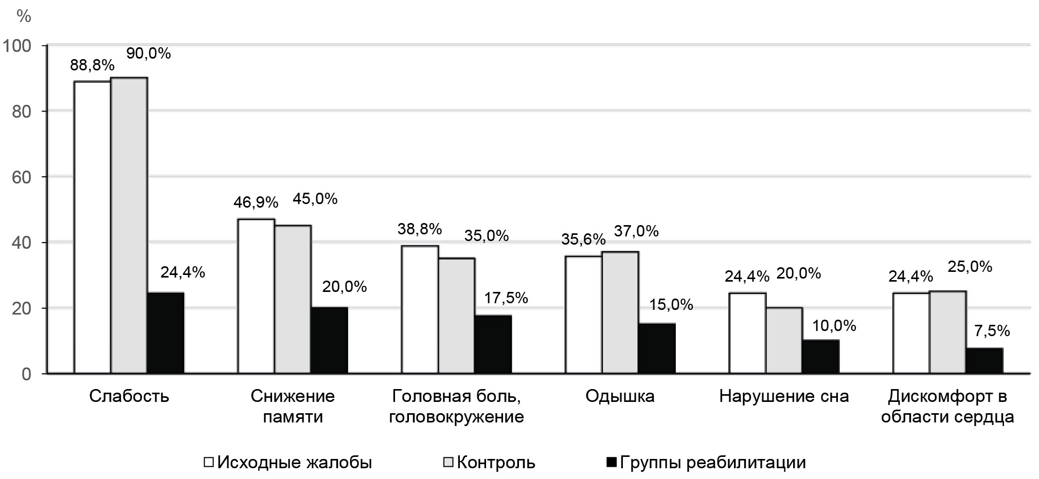 На фоне проводимых реабилитационных мероприятий отмечены следующие изменения клинико-инструментальных и лабораторных показателей обследованных пациентов. В группах пациентов, получавших комплексную реабилитацию с включением преформированных физических факторов, зафиксирован достоверный регресс основных жалоб: слабость, повышенная утомляемость выявлена в 24,2% случаев, снижение памяти ― в 20%, головная боль, головокружение ― в 17,5%, одышка ― в 15%, нарушение сна ― в 10%, тахикардия и дискомфорт в области сердца ― в 7,5%. В контрольной группе значимой динамики жалоб не выявлено (рис. 2).