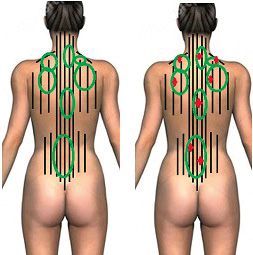 Все пациенты не имели противопоказаний для проведения инъекций и не получали дополнительной терапии. Лечение осуществлялось после нахождения болевых точек на коже спины по следующей методологии в два этапа.