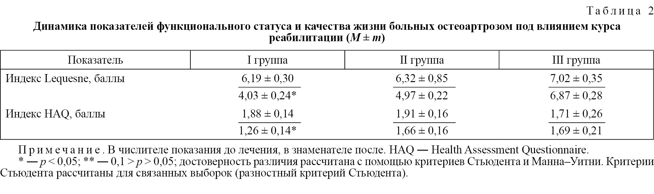 Таблица 2. Динамика показателей функционального статуса и качества жизни больных остеоартрозом под влиянием курса реабилитации (M ± m)