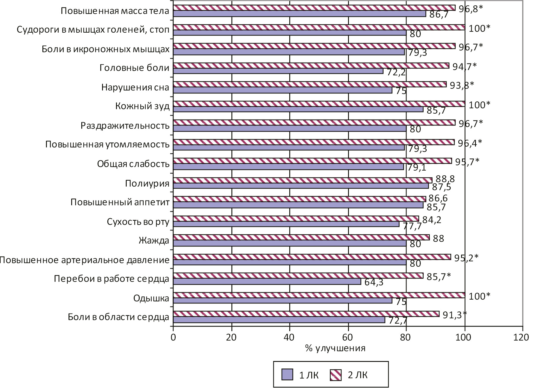 Анализ показателей КЖ больных ИБС, ассоциированной с СД2, проведенный через год после курортного лечения, выявил существенное преимущество комплексного применения питьевых МВ, углекислых минеральных ванн и системной МТ в сравнении с традиционной бальнеотерапией: частота приступов стенокардии в течение 1 года в ОГ снизилась в 6 раз против 2,8 раз в ГС.