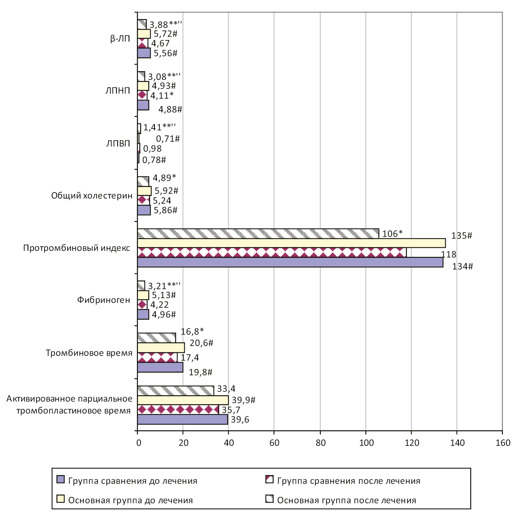 * — р < 0,05 и ** — р < 0,01 — достоверность различий по сравнению с показателями до лечения; # — р < 0,05 — достоверность различий по сравнению с показателями у здоровых лиц; ″ — р < 0,05 — достоверность различий относительно показателей ГС. b-ЛП — бета-липопротеины; ЛПВП — липопротеины высокой плотности; ЛПНП — липопротеины низкой плотности.