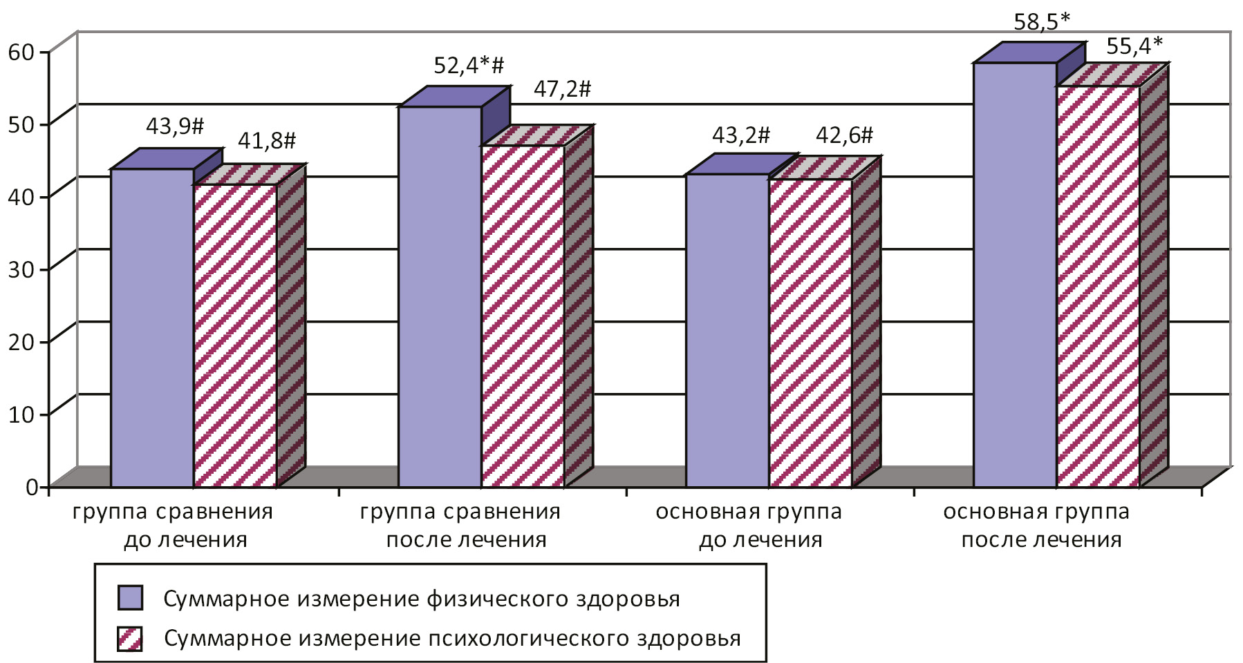 * — р < 0,05 — достоверность различий по сравнению с показателями до лечения; # — р < 0,05 — достоверность различий по сравнению с показателями у здоровых лиц.