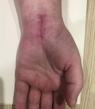 Fig. 1. Formation of keloid scar in the area of surgical decompression of the carpal tunnel with increased intracarpal pressure and increasing conflict of the median nerve with the surrounding tendons in the carpal tunnel.