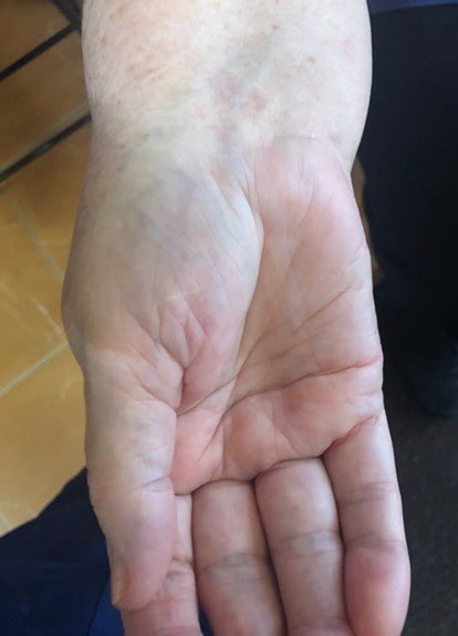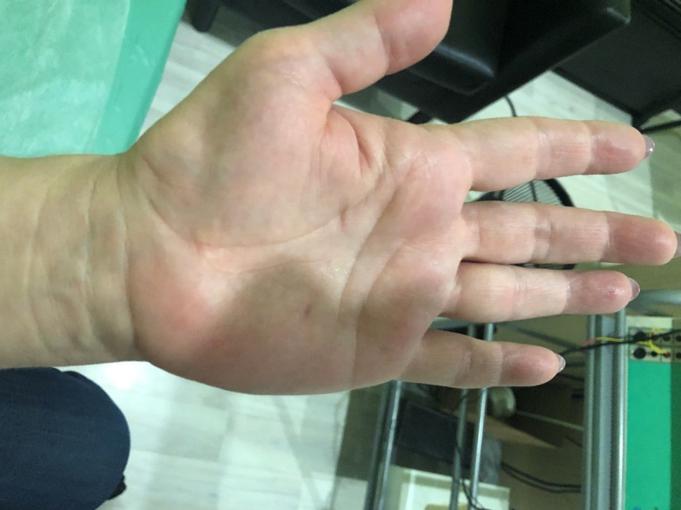 Рис. 3. Гипотрофия мышц тенара, сохранившаяся у пациента после успешной хирургической декомпрессии карпального канала.