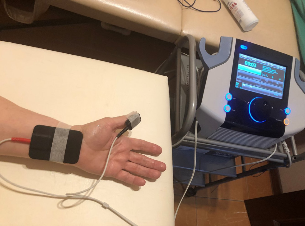 Fig. 4. Technique of median nerve stimulation using low-frequency transcutaneous electroneurostimulation.