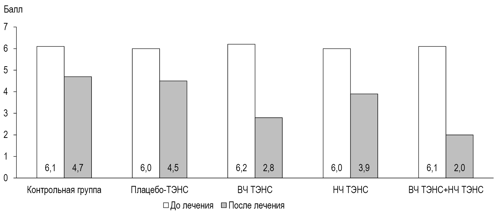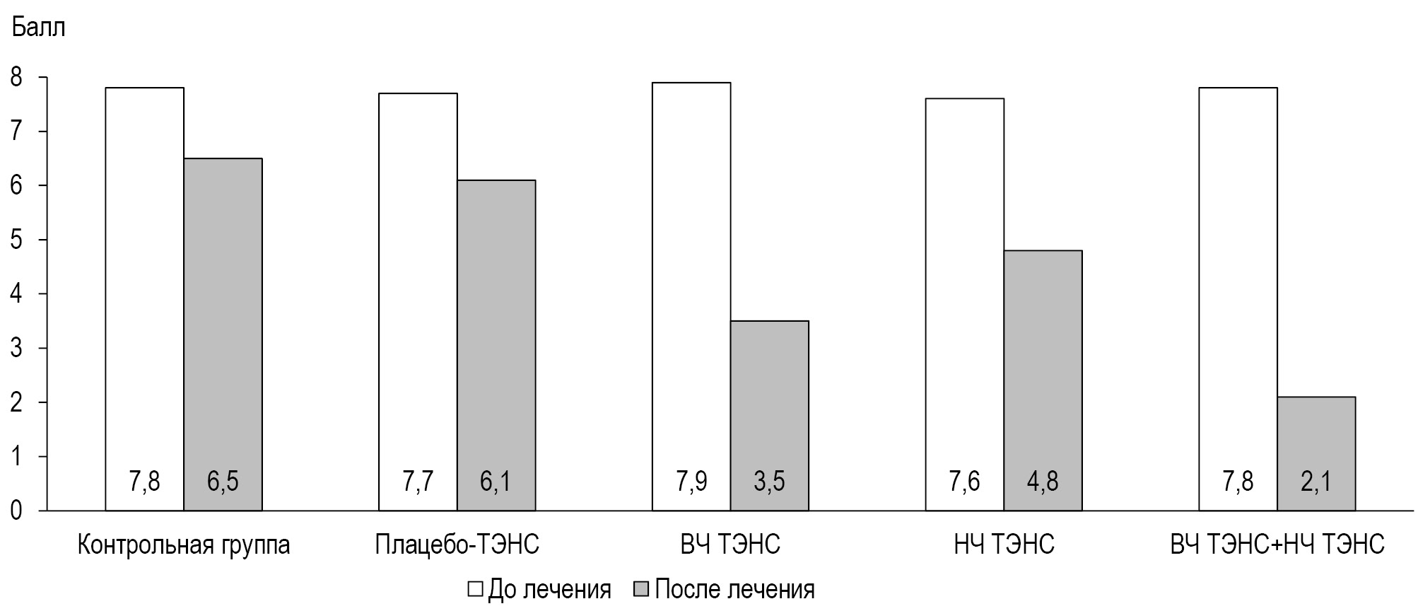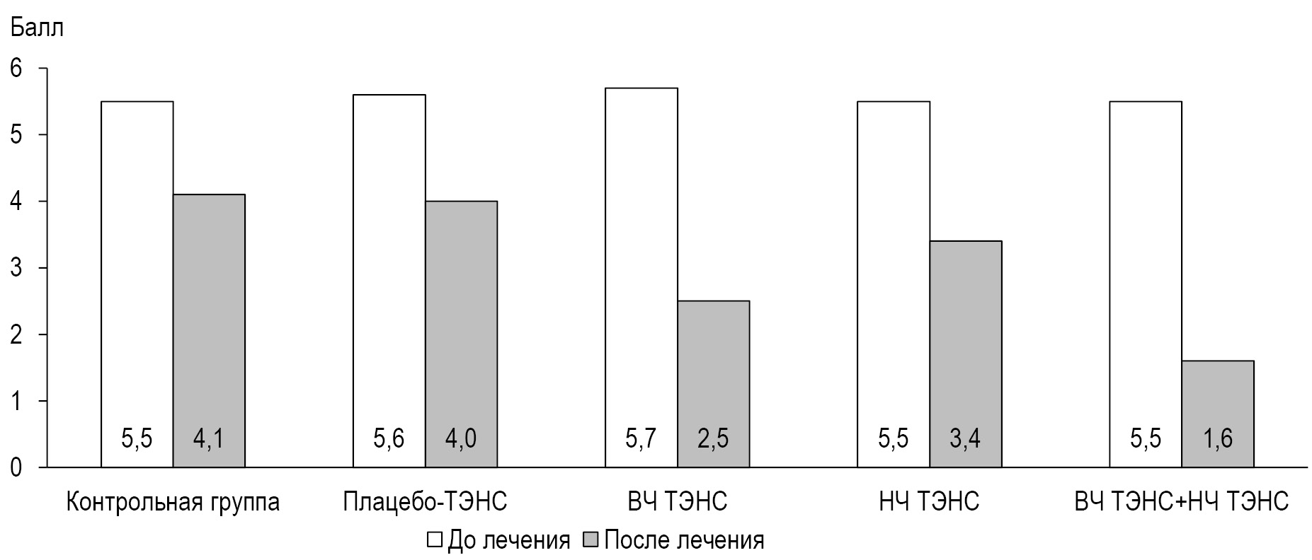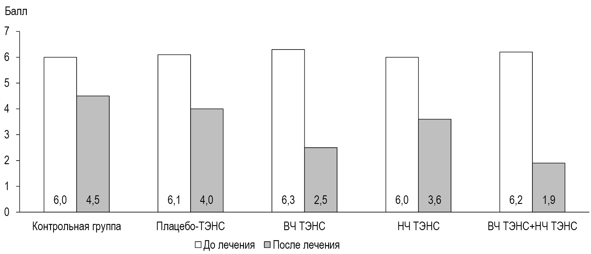 Более выраженный терапевтический эффект был выявлен при применении ВЧ ТЭНС и НЧ ТЭНС. Однако эти группы имеют некоторые отличия между собой. Так, ВЧ ТЭНС оказалась в 2 раза сильнее в снижении позитивных сенсорных симптомов по сравнению с НЧ ТЭНС.