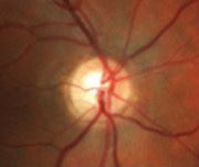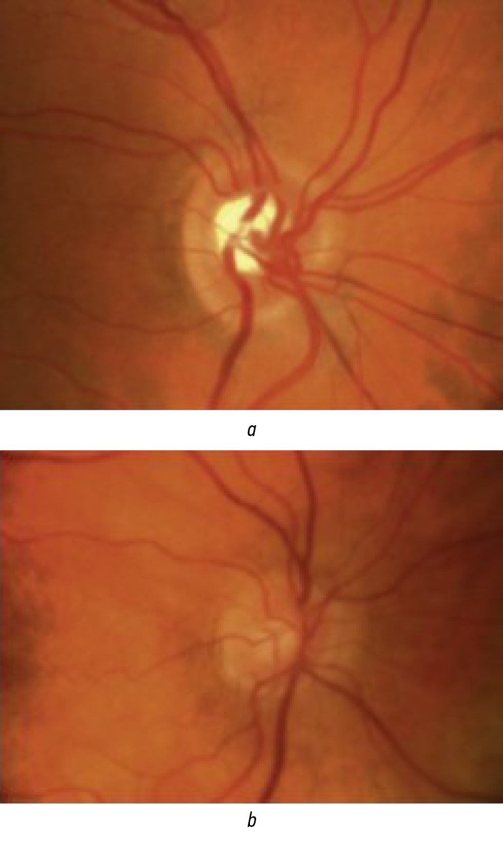 При подозрении на глаукому у пациента важно оценить состояние диска зрительного нерва [21]. На рис. 1 представлен вид диска зрительного нерва в норме. Для описания диска зрительного нерва обычно используют международное правило ISNT, которое позволяет определить относительный размер ретинального пояска в различных областях вокруг диска зрительного нерва. Самая широкая зона диска зрительного нерва ― нижняя (Inferior), затем по убывающей следуют верхняя (Superior), назальная (Nasal) и темпоральная (Temporal) зоны. Отклонение от этого правила («косой» выход при нарушении рефракции от -6,0 до +6,0 диоптрий) подразумевает дальнейшее обследование и не всегда свидетельствует о наличии глаукомы.