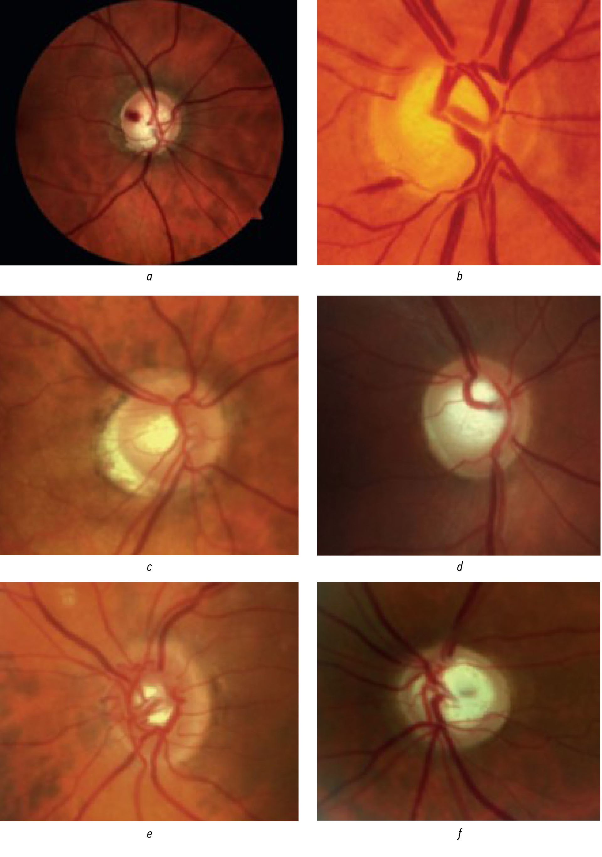 Рис. 3. Неспецифические признаки глаукоматозного повреждения: дисковые кровоизлияния (a, b); обнажение нижней окружности кровеносных сосудов (с); перегиб кровеносных сосудов (d, e); потеря нейроретинального пояска в назальном квадранте (f).