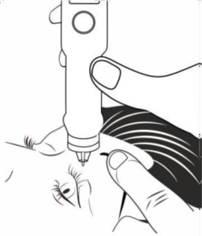 Достаточно простая методика измерения внутриглазного давления способствует эффективному обучению работе с прибором. По статистике, навык правильного использования прибора приобретается уже через 10–20 минут при измерениях на упругом тесте или на подушечках собственных пальцев. Измерение внутриглазного давления с помощью ТВГД-2 можно производить в любой доступной точке склеры или роговицы глаза через веко. Однако существуют рекомендуемые зоны для измерения, удобные как для врача, так и для пациента (рис. 6, 7). Главные условия, необходимые для получения достоверных результатов измерения: установка штока прибора перпендикулярно к поверхности глаза; вертикальное положение корпуса прибора; плавность и точность движений при измерении (равномерная скорость движений ― около 2 см/сек). Плавность и точность движений легко обеспечивается при опоре руки, удерживающей тонометр, на голову (лоб) пациента.