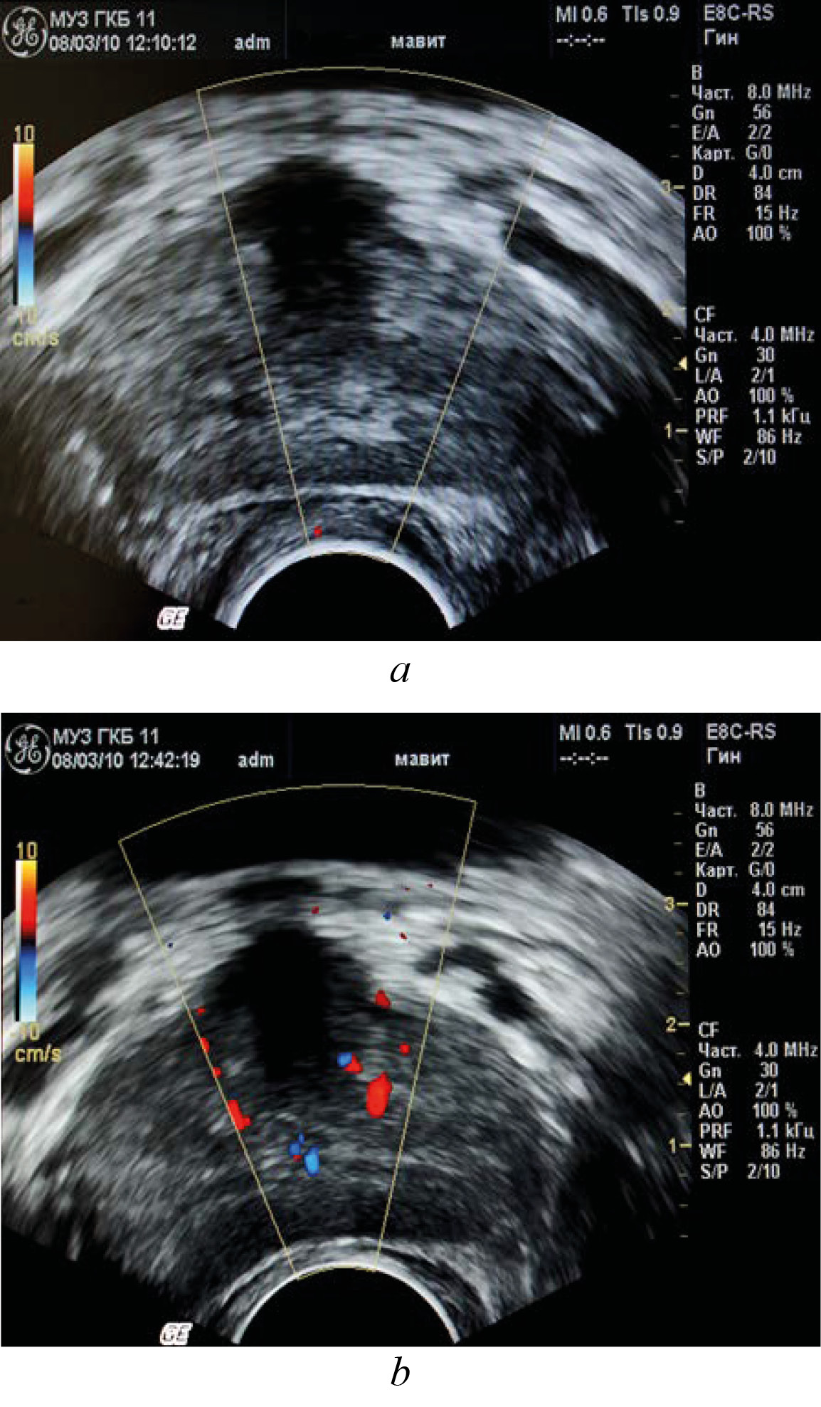 Fig. 3. Dopplerogram of the prostate before (a) and after (b) the session of physiotherapy on the device MAVIT.