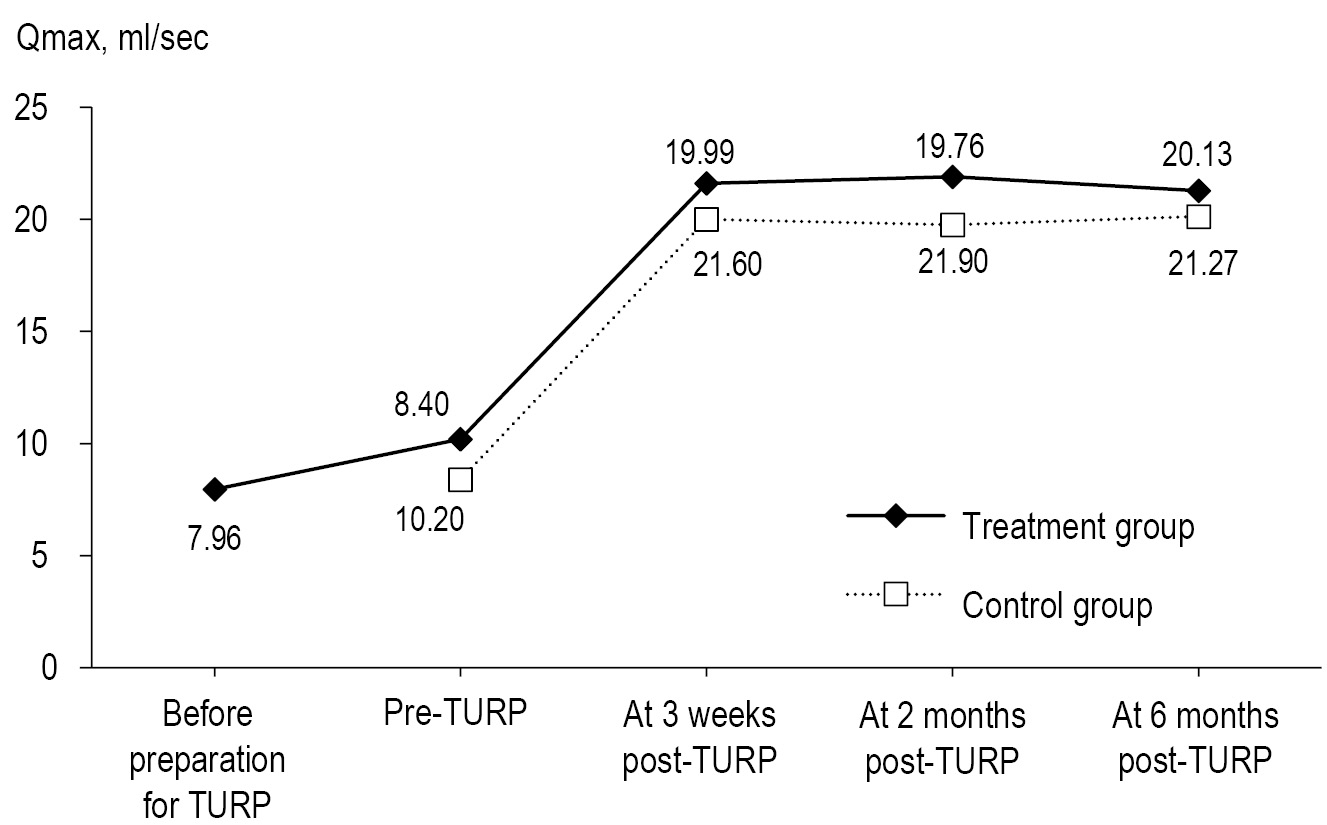 Maximum urinary flow rate, mL/s | 7.64±0.65 | 10.6±0.74 | <0.01 |