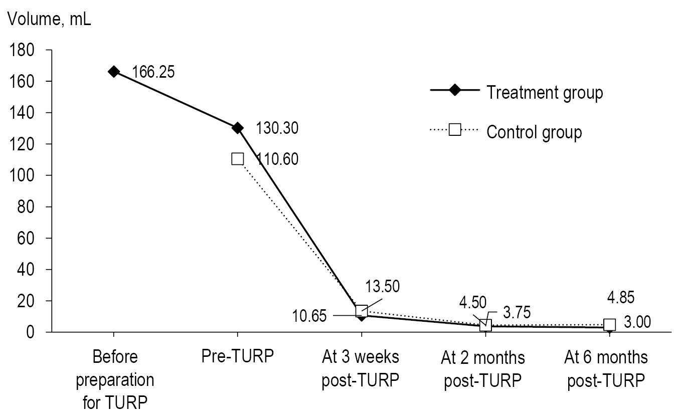 Fig. 8. Dynamics of the average residual urine volume in the compared groups.