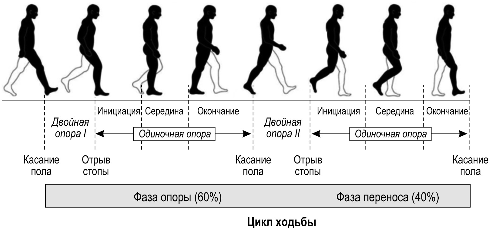 Нормальная походка может рассматриваться как серия цикличных, автоматизированных, повторяющихся и скоординированных движений конечностей и туловища с минимальными затратами энергии, которые приводят к продвижению общего центра масс (ОЦМ) тела вперёд. При ходьбе ОЦМ наряду с поступательными движениями (вперёд) совершает движения в сагиттальной и фронтальной плоскостях. Перемещение ОЦМ представляет собой синусоидальный процесс с частотой, соответствующей двойному шагу в медиолатеральном направлении, и с удвоенной частотой в переднезаднем и вертикальном направлении [14]. Ходьба человека характеризуется с помощью отдельных циклов и функциональных фаз, каждая из которых способствует прямолинейности передвижения с минимальным смещением ОЦМ и адекватными энергозатратами [15, 16]. Как показано на рис. 1, цикл ходьбы состоит из двух основных фаз — опоры и переноса, делящихся на пять и три функциональные фазы [17, 18]. Отклонения в фазах походки связаны с нарушением многоуровневой системы координации двигательного акта, изменением центрального контроля функционирования базовых элементов движения (костно-суставной и мышечной систем).