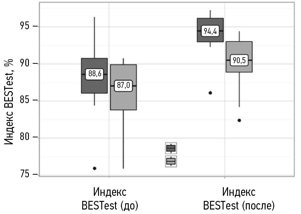 MATERIALS AND METHODS: This single-center, prospective, continuous, controlled, randomized study involved 38 patients from the pediatric neuropsychiatric department of a Russian children’s clinical hospital (mean age: 13–16 years). All of them had a confirmed diagnosis of relapsing-remitting multiple sclerosis. The patients were examined in the pediatric medical rehabilitation department using the Balance Evaluation Systems Test at the beginning and at the end of a therapeutic exercise course conducted on a daily basis for 10 days. The patients were randomized into two groups, 19 persons each. The control group was offered standard balance exercises; in the experimental group, exercises were selected individually for each patient, considering the identified postural control defects.