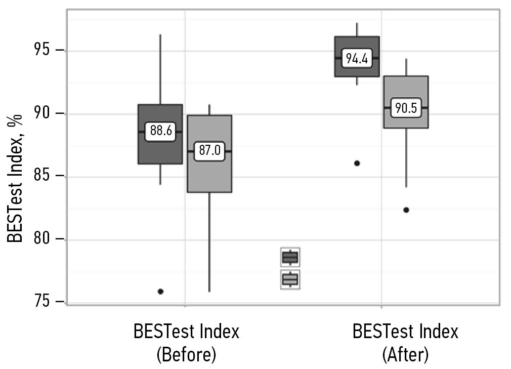 Analysis of the experimental group (group I) and the control group (group II) showed no statistically significant differences before the physical therapy (PT) course (p = 0.214). After completion of the PT course, statistically significant differences were identified between the groups (p < 0.001), as assessed using the Mann–Whitney U test. Additionally, both groups showed statistically significant improvements in BESTest scores after the intervention (p < 0.001), according to the Wilcoxon signed-rank test (see Fig. 3).