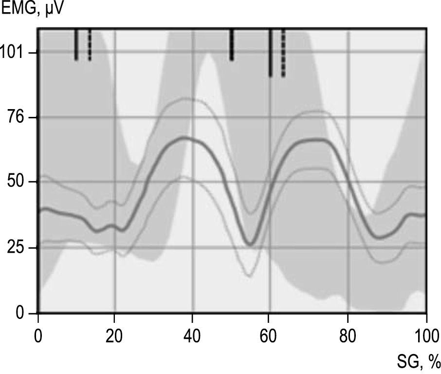 As part of the instrumental gait analysis, EMG activity of the gastrocnemius muscle was evaluated. In his study, Winter described the EMG pattern of this muscle in healthy individuals as a bell-shaped curve with a peak at approximately 40% of the gait cycle, during the single support phase, corresponding to the moment of maximal isometric contraction of the gastrocnemius muscle, followed by a rapid and complete decline (Fig. 1) [17].