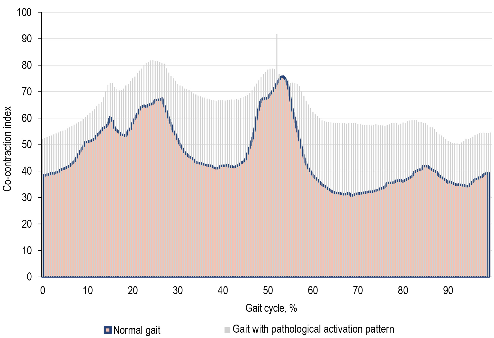 This sustained activation of the gastrocnemius muscle affects the biomechanics of ankle joint movement, as it overlaps with the normal activation of antagonist muscles in the subsequent phase of the gait cycle. The phenomenon of simultaneous activation of antagonist muscles is referred to as co-contraction. Under physiological conditions, co-contraction enhances joint stability and contributes to movement precision in the limbs, and it is associated with increased energy expenditure. Whereas increased joint stiffness during the stance phase may be attributed to impaired motor control and can serve a compensatory function, such a phenomenon during the swing phase lacks a compensatory role and pathologically alters gait biomechanics. At the same time, qualitative assessment of joint stiffness remains challenging for both experimental and computational methods. In contrast, the quantitative evaluation of muscle co-activation using the co-contraction index (CCI), based on electromyographic (EMG) data, is more feasible and may serve as an alternative measure of joint stability.
