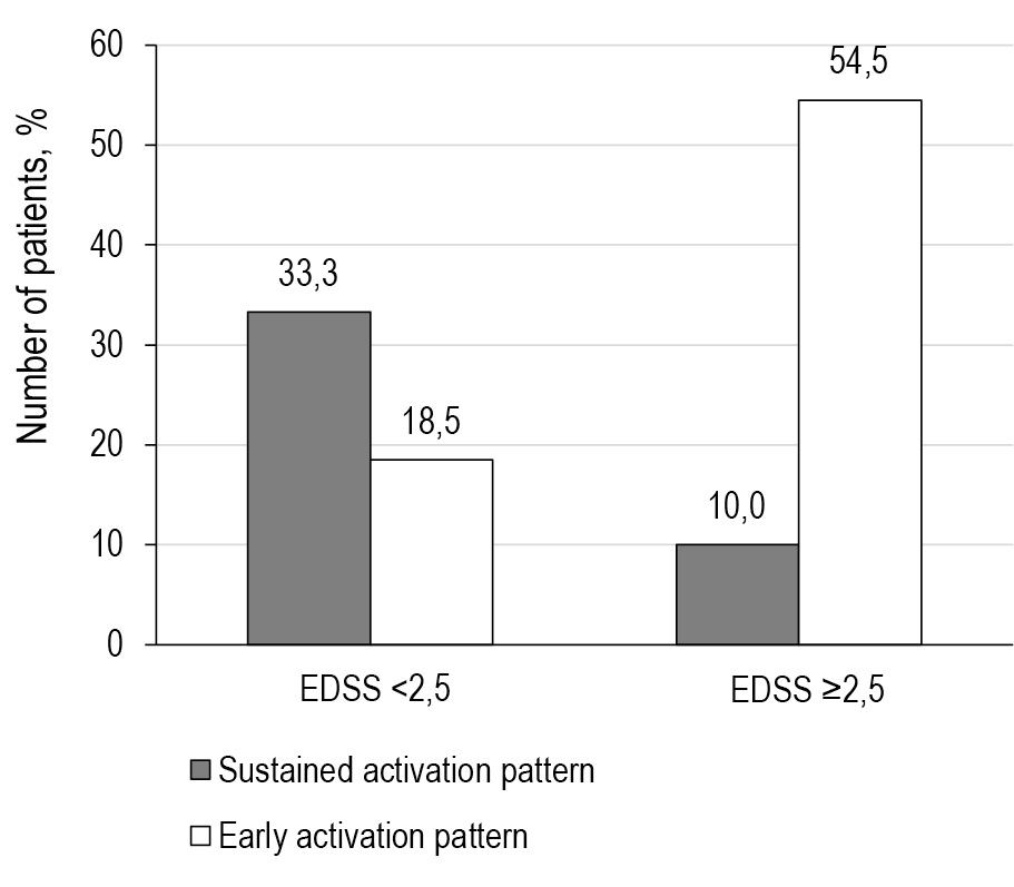 In addition, a specific association was observed in patients who were not included in the main study group. These patients had higher disability scores and were diagnosed with either secondary progressive or primary progressive forms of the disease. The proportion of the first and second types of pathological patterns in the gastrocnemius muscle differed. Among the studied group of children with low levels of disability, the prevalence of the sustained activation pattern exceeded that of the early activation pattern—33.3% vs 18.5%. In contrast, among children with disability scores > 2.5 on the EDSS, the sustained activation pattern remained more prevalent (54.5% vs 10%) (Fig. 7).