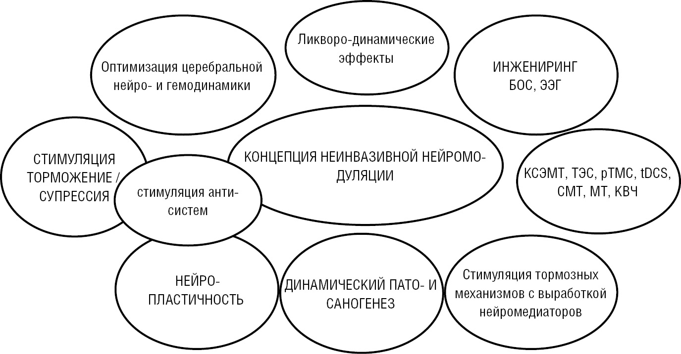 Рис. 2. Концептуальные основы неинвазивной нейромодуляции. КСЭМТ — краниоспинальная электромагнитотерапия; ТЭС — транскраниальная электростимуляция; рТМС — ритмическая транскраниальная магнитная стимуляция; tDCS — транскраниальная стимуляция постоянным током; СМТ — синусоидальные модулированные токи; МТ — магнитотерапия, КВЧ — терапия токами крайне высокой частоты.