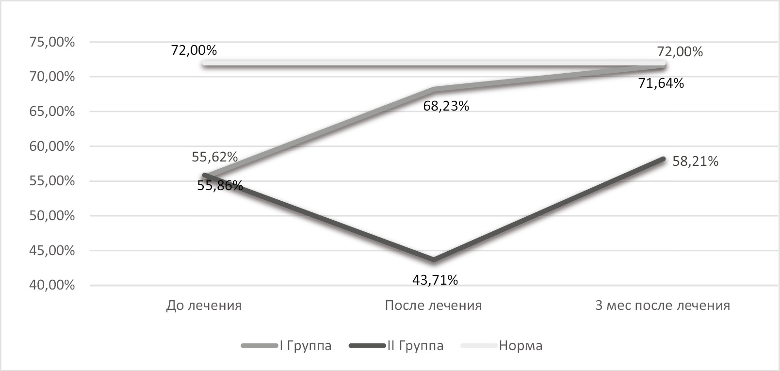 Группа | Норма, баллы | До лечения, баллы | После лечения, баллы | Через 3 мес после окончания лечения, баллы |