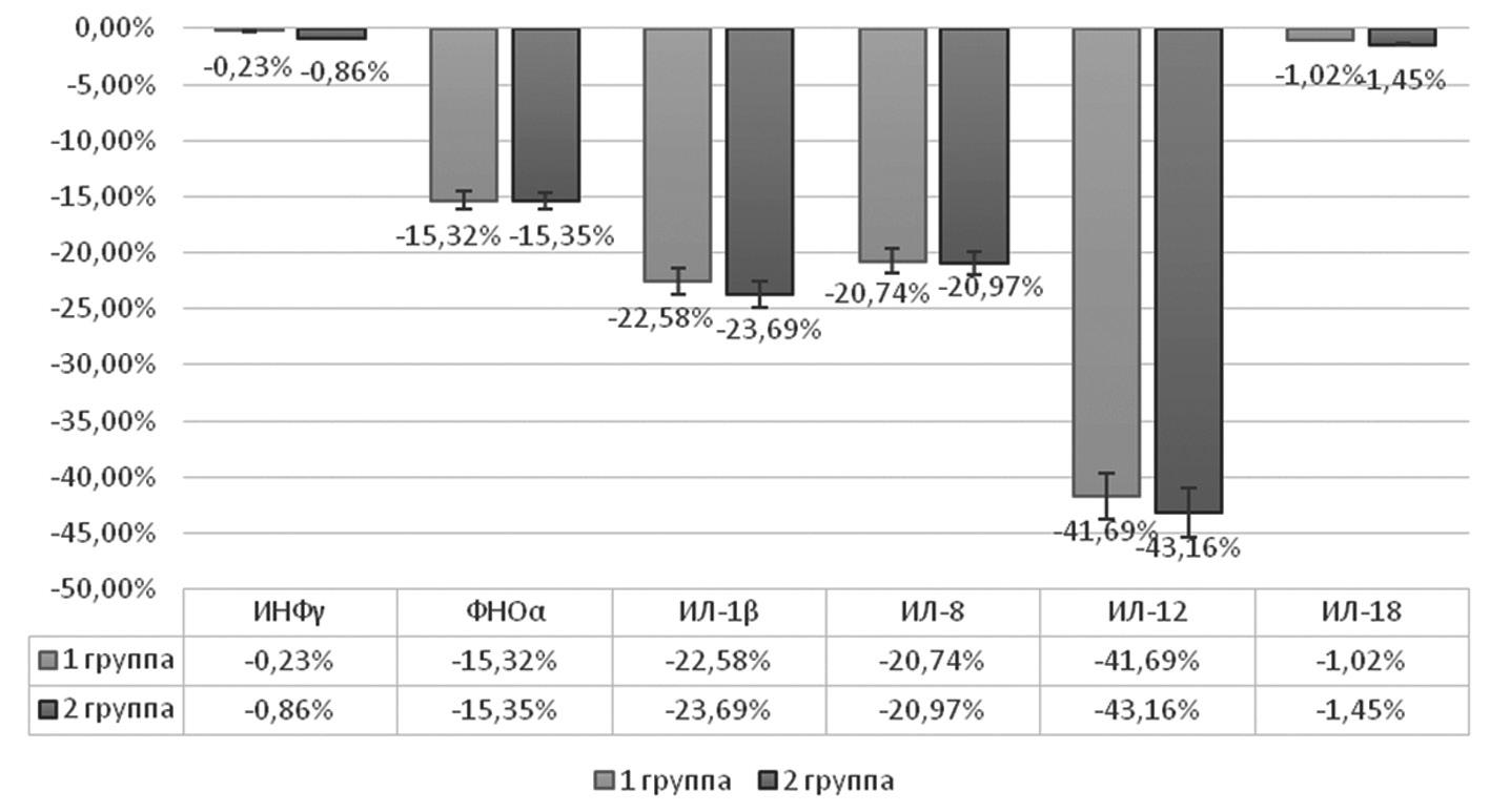 Динамика показателей цитокинового профиля в основной группе/группе сравнения составила ФНОα — 15,32%/15,35%, ИЛ-1β — 22,58%/23,69%, ИЛ-8 — 20,74%/20,97%, ИЛ-12 — 41,69%/43,16%. Достоверно значимых изменений концентрации ИНФγ и ИЛ-18 ни в одной группе не выявлено (рис. 2).