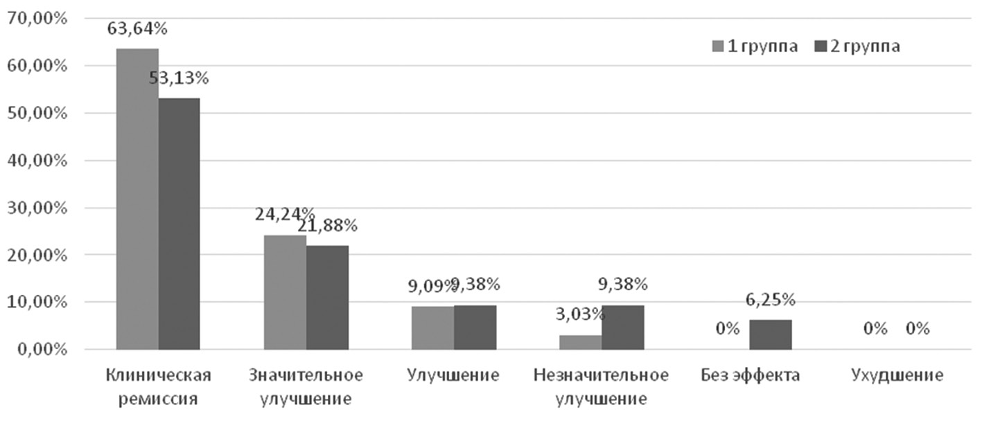 В соответствии с динамикой индекса IGA и качества жизни пациентов с акне в 1-й группе 63,64% (n = 21) больных достигли клинической ремиссии, у 24,24% (n = 8) больных отмечено значительное улучшение, у 9,09% (n = 3) — улучшение; у 3,03% (n = 1) — незначительный клинический эффект, отсутствие эффекта или ухудшение не выявлено ни у одного пациента 1-й группы; во 2-й группе у 53,13% (n = 17) больных отмечалась клиническая ремиссия, у 21,88% (n = 7) больных отмечено значительное улучшение, у 9,38% (n = 3) — улучшение; у 9,38% (n = 3) — незначительное улучшение и у 6,25% (n = 2) пациентов эффекта не наблюдалось, ухудшения состояния не наблюдалось. Таким образом, показатель индекса GSS в 1-й группе составил 96,97%, а во 2-й группе — 84,39% (рис. 3).