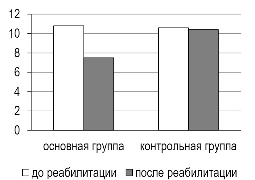 When assessing the domain “d240, handling stress and other psychological demands” on the Spielberger–Khanin scale, the patients in the study group reported a 10.9% decrease in the anxiety level: from 33.1±1.5 to 29.5±1.4 points (p < 0.001). When assessing the level of depression on the Beck scale in the study group, a 30.5% decrease was found: from 10.8±1.3 to 7.5±1.2 points (p <0.001); Fig. 3. No significant change was found in the comparison group, from 33.7±2.3 to 32.7±2.1 points (p=0.27) and from 10.6±0.9 to 10.4±1.3 points (p=0.09), respectively.