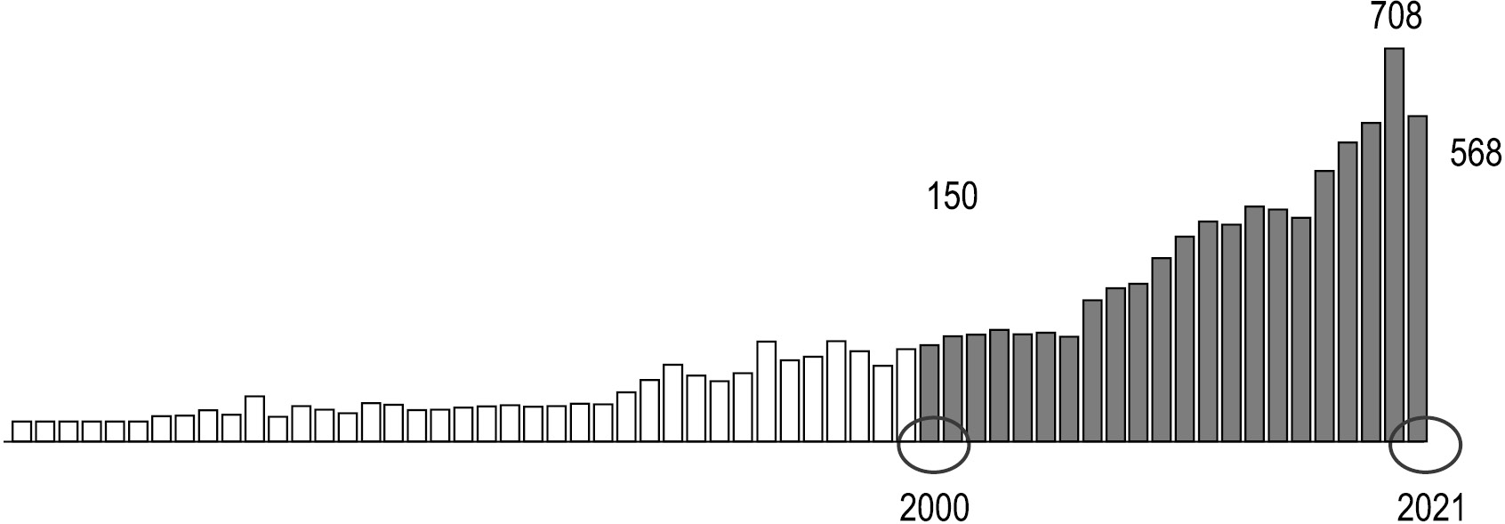 В связи с нарастающим интересом специалистов всего мира к проблеме СМА с каждым годом количество публикаций значительно увеличивается: от 150 печатных работ в 2000 г. до >700 в 2020 г., при этом за конец сентября 2021 г. число публикаций составило 568 (рисунок).