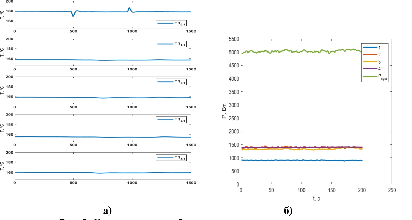 Необходимо отметить, что баланс подводимого и отводимого от каждой петли тепла всегда сохранялся; пример изменения мощностей приведен на рис. 5б, где линии 1-4 соответствуют значениям снимаемой с каждой петли мощности, линия Pсум соответствует суммарной снимаемой мощности с контура. При увеличении подводимой мощности до 6,4 кВт (рис. 6б) температуры на входе в источник тепла повышались до 170-175 °C, а разница температур на входе и выходе из модели ТВС составляла около 30 °C. Было проведено тестирование особенностей развития естественной циркуляции теплоносителя в условиях неравномерного теплосъема на разных циркуляционных петлях. Для создания такого режима создавалось условие отвода меньшего количества тепла от одной из циркуляционных петель по сравнению с другими. Обеспечение неравномерных условий создавалось с помощью управления начальной температурой теплоносителя второго контура.