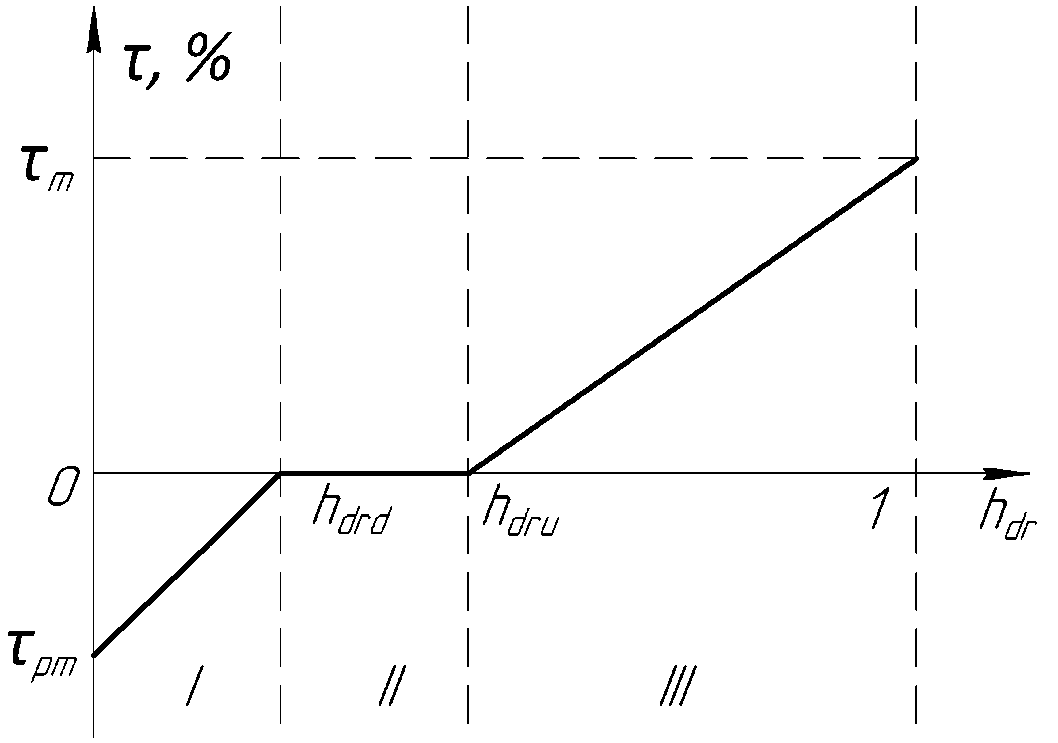 Электромеханическая силовая передача, включающая тяговый привод и механическую трансмиссию, позволяет реализовывать рекуперативное замедление при отпускании педали хода. При этом можно выделить три зоны работы привода в зависимости от положения педали: I – тормозной режим; II – режим движения по инерции; III – тяговый режим (рис. 1).