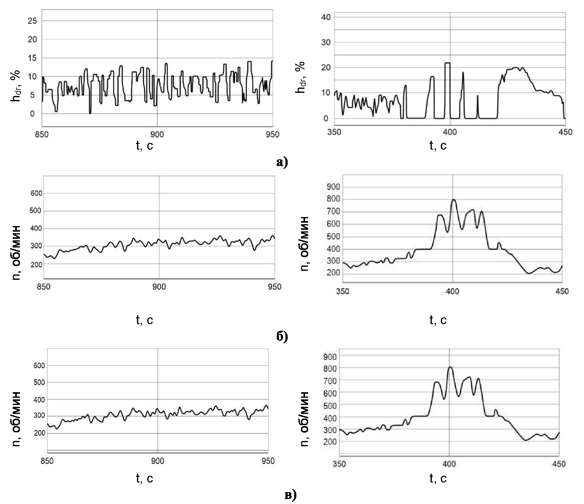 Рис. 5. Реализации положения педали хода и частот вращения роторов тяговых электродвигателей при S-образном характере зависимости уставок крутящего момента (слева ‒ фрагмент 1; справа – фрагмент 2): а) положение педали хода, %; б) частота вращения ротора левого электродвигателя, об/мин; в) частота вращения ротора правого электродвигателя, об/мин
